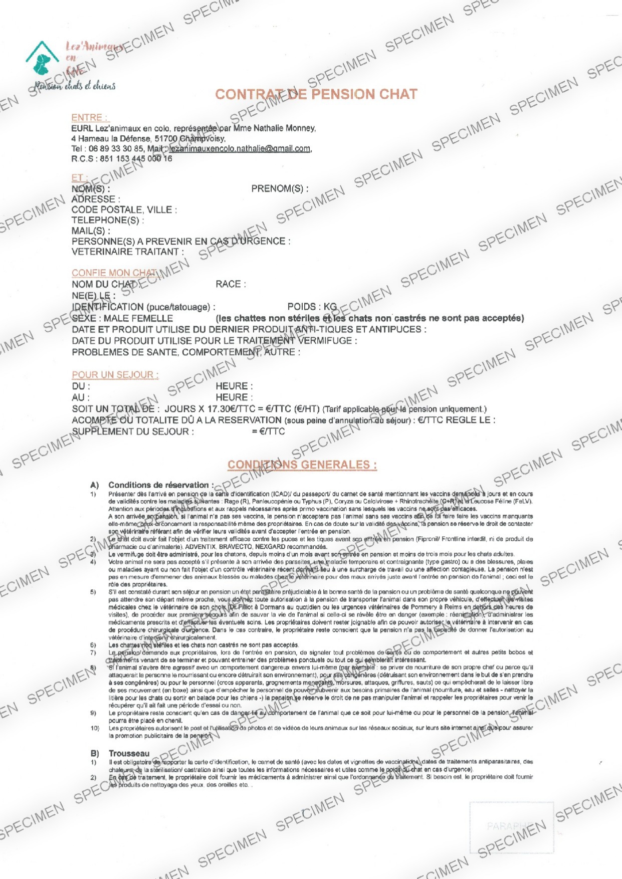 La première partie du contrat concerne les coordonnées de la pension ainsi que celles du (des) propriétaire(s) du chat.