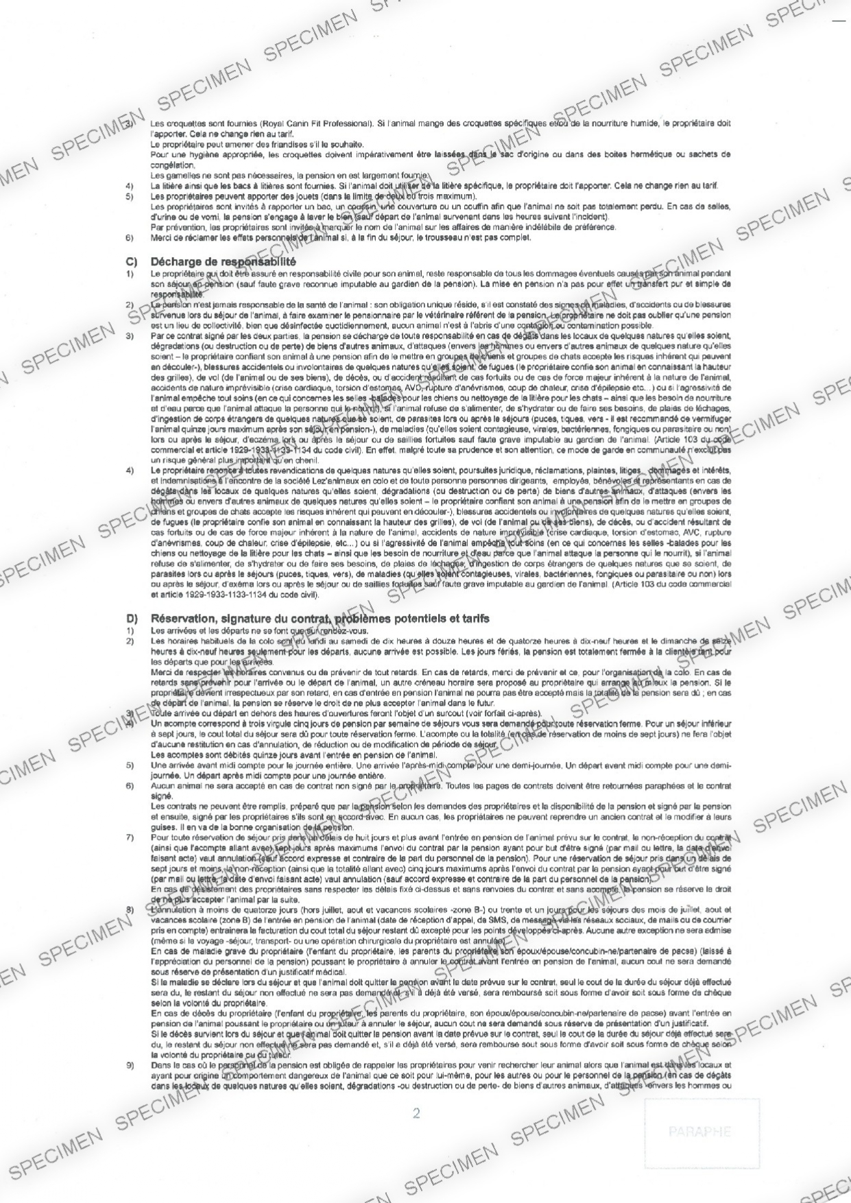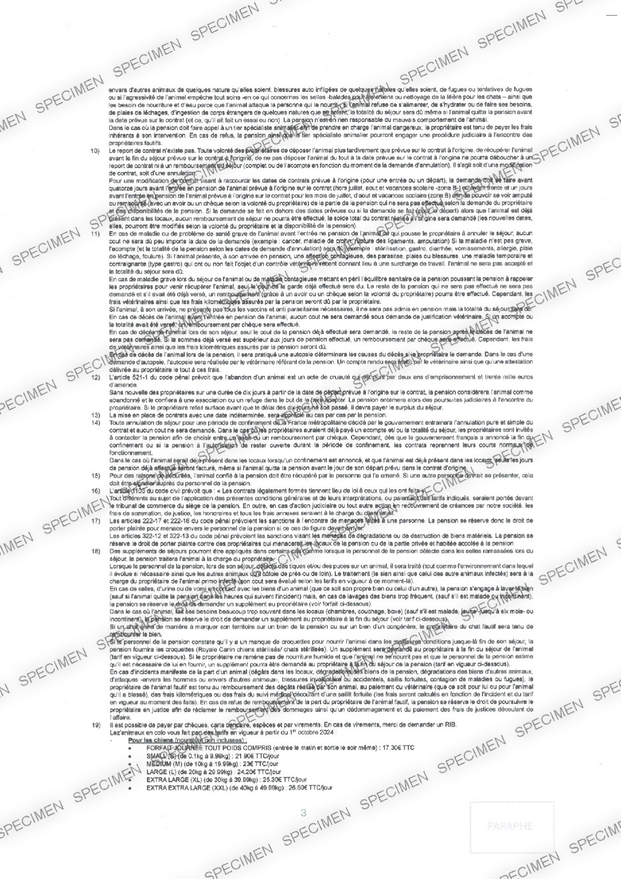 Aucun animal ne sera accepté si le contrat n'est pas signé par les propriétaires. L'établissement du contrat pour un séjour doit être effectué par la pension. Les clients ne peuvent en aucun cas reprendre un ancien contrat, le modifier et l'utiliser à leur guise. Pourquoi ? La signature d'un contrat garantit la bonne compréhension des termes pour les deux parties. Sans cela, l'une des deux parties pourrait se retrouver dans une situation de malhonnêteté envers l'autre sans aucune garantie. Les contrats sont régulièrement modifiés afin de garantir la sécurité des propriétaires et de la pension. Utiliser un ancien contrat reviendrait à revenir en arrière en matière de protection pour les deux parties. Il est également crucial pour assurer une bonne organisation administrative de la pension et des documents comptables.